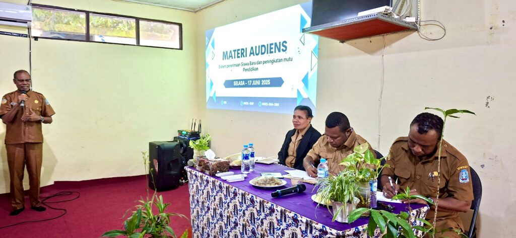 SENTANI, jayapurakab.go.id – Dinas Pendidikan Kabupaten Jayapura melalukukan audiens bersama pengurus Musyawarah Kepala Kepala Sekolah (MKKS) Kabupaten Jayapura terkait sistem penerimaan murid baru (SPMB) tahun pelajaran 2025/2026 dan peningkatan mutu, yang berlangsung di SMP N 2 Sentani, Selasa, 17/06/2025.