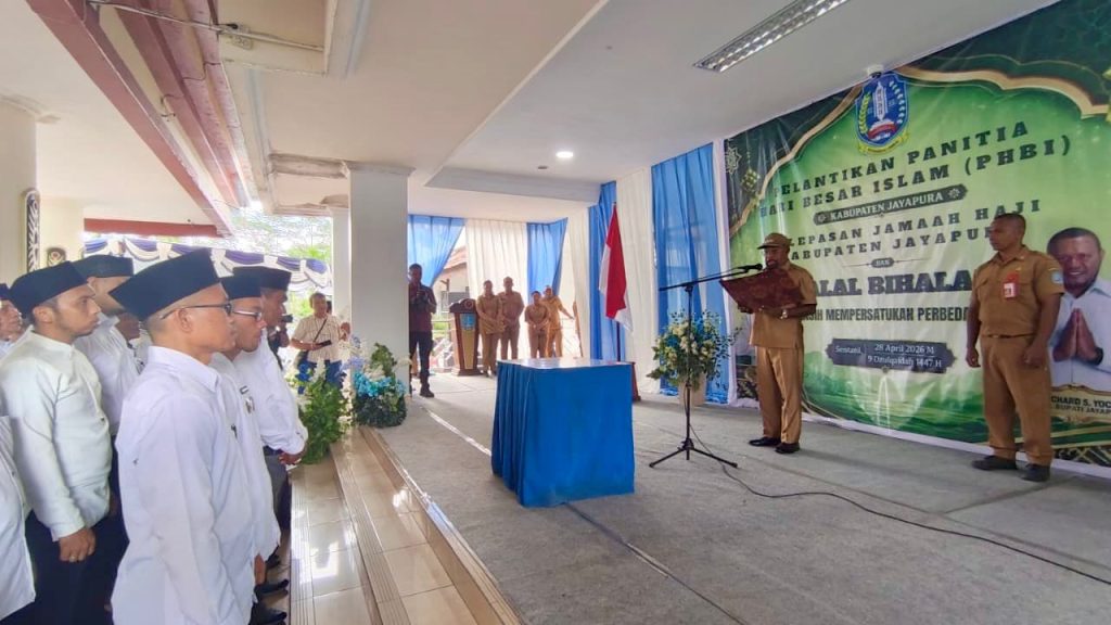 SENTANI, jayapurakab.go.id – Bupati Jayapura, Dr. Yunus Wonda, S.H., M.H., bersama Wakil Bupati Jayapura Haris Richard Yocku, S.H., melantik pengurus Panitia Hari Besar Islam (PHBI) Kabupaten Jayapura yang dirangkaikan dengan pelepasan Jemaah Haji Kabupaten Jayapura tahun 2026, serta kegiatan Halal Bihalal Pemerintah Daerah Kabupaten Jayapura yang dilaksanakan di Halaman Kantor Bupati Jayapura, Selasa (28/04/2026).