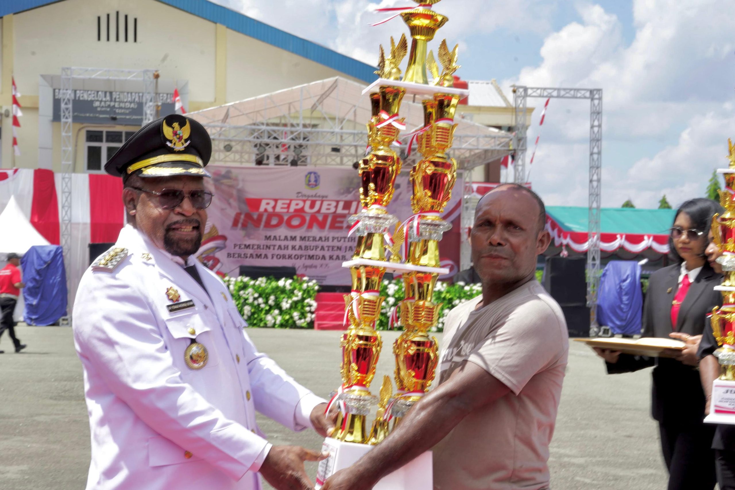 SENTANI, jayapurakab.go.id – Bupati Jayapura, Dr. Yunus Wonda, S.H., M.H., dan Wakil Bupati Jayapura, Haris Richard S. Yocku, S.H, menyerahkan piala Baca…