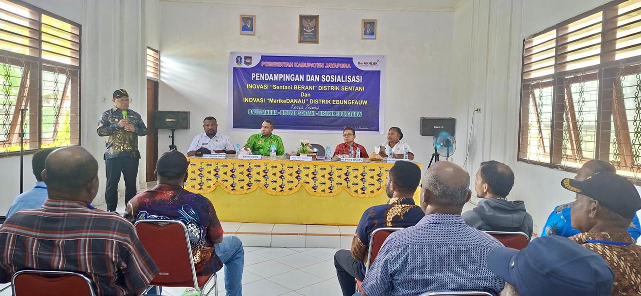 SENTANI, jayapurakab.go.id – Guna memacu percepatan Inovasi Daerah, Pemerintah Distrik Sentani dan Distrik Ebungfauw menggandeng Balitbangda Kabupaten Jayapura menggelar kegiatan Pendampingan dan Sosialisasi. Dua program unggulan, ‘Sentani Berani’ dan ‘Mari ke Danau” diluncurkan. Wakil Bupati Jayapura, Haris Richard S. Yocku, S.H., hadir secara langsung untuk membuka semangat kolaborasi ini, di Aula Kantor Distrik Sentani, Kamis (13/11/2025).