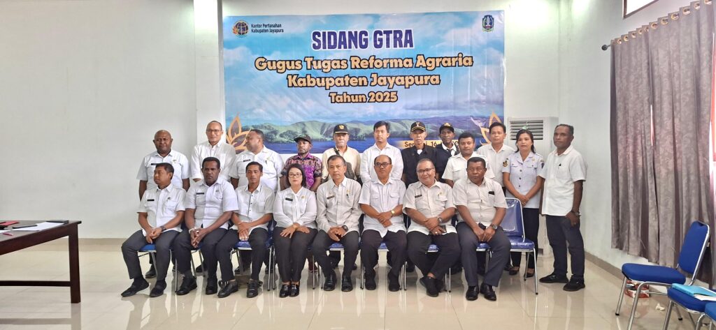 SENTANI, jayapurakab.go.id – Kementerian Agraria dan tata ruang Badan Pertanahan Nasional (BPN) kantor pertanahan bersama Pemerintah Kabupaten Jayapura melakukan pertemuan kegiatan tim Gugus Tugas Reformasi Agraria (GTRA) tahun 2025 yang dilaksanakan di Aula Kantor Pertanahan Kabupaten Jayapura, Rabu (16/7/2025).