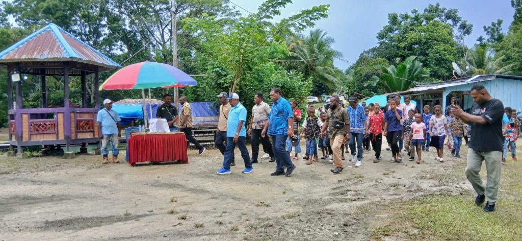 SENTANI, jayapurakab.go.id – Bupati Kabupaten Jayapura, Dr. Yunus Wonda bersama sejumlah pimpinan OPD menghadiri kegiatan “Makan Sumbang dan Mandi Gratis” untuk penggalangan dana renovasi Gedung Gereja GKI Elim Berap di Pemandian Kali Biru, Kampung Berap, Distrik Nimbokrang.