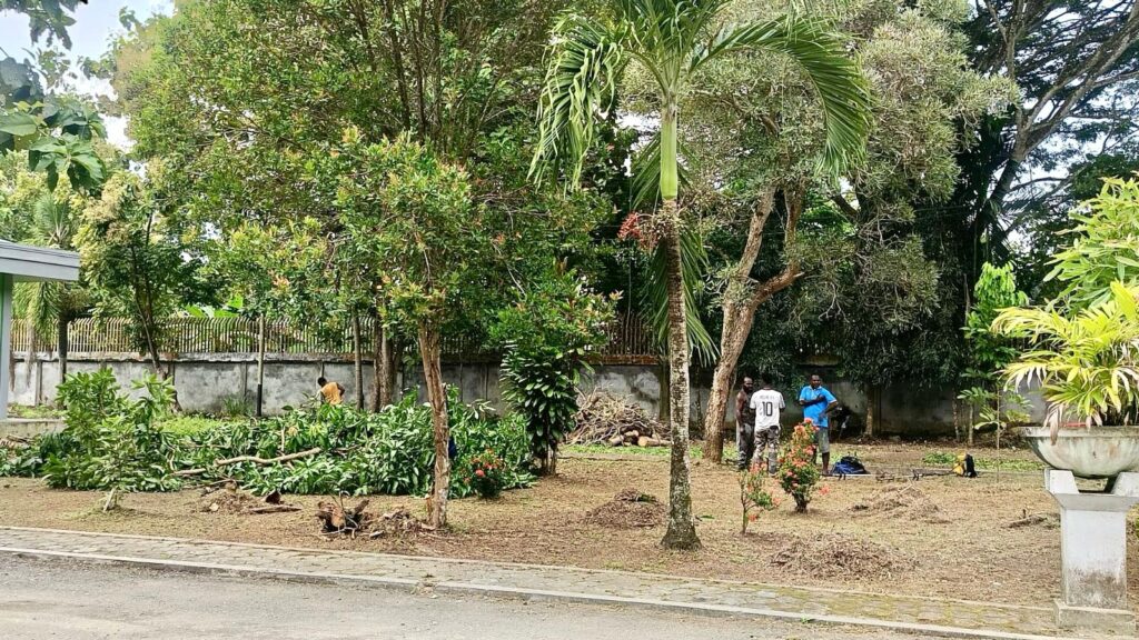 SENTANI, jayapurakab.go.id – Resmi menjabat Plt. Kepala Dinas Kesehatan Kabupaten Jayapura, dr. Anton Tony Mote langsung membersikan lingkungan Kantor Dinas Kesehatan Kabupaten Jayapura dari jalan masuk hingga halaman kantor kesehatan dengan membersihkan sampah-sampah yang menumpuk dan ranting-ranting pohon, kata dr. Mote saat diwawancara usai melihat proses pembersihan lingkungan kantor, Senin, 28/04/2025.