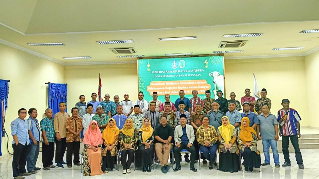 SENTANI, jayapurakab.go.id – Gandeng Majelis Ulama Indonesia (MUI) Pemerintah Kabupaten Jayapura, melalui Dinas Peternakan dan Perkebunan melakukan sosialisasi kebijakan kegiatan hewan qurban dalam rangka hari raya Idul Adha 1445 H tahun 2024 di Aula II Kantor Bupati Jayapura, Sabtu, 08/06/2024.