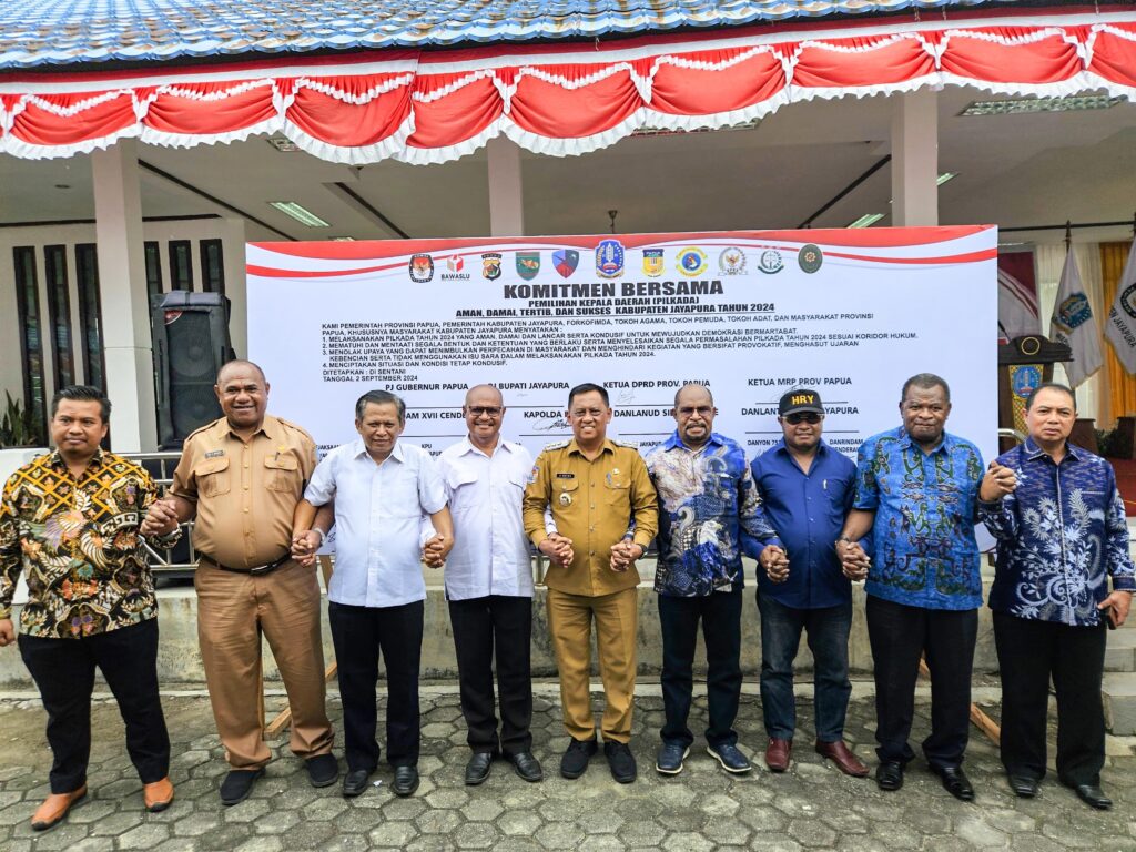 Usai melakukan doa lintas agama dilakukan penandatanganan komitmen bersama Pilkada yang aman, damai, tertib dan sukses yang dilakukan semua pihak, baik dari pemerintah, KPU, Bawaslu, TNI-Polri dan semua lembaga atau instansi pemerintah, tokoh adat, tokoh masyarakat dan tokoh agama untuk sama-sama mensukseskan Pilkada Serentak 2024 di Kabupaten Jayapura.