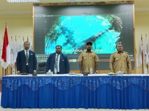 Bupati Jayapura, Dr. Yunus Wonda, SH, MH bersama Wakil Bupati Jayapura, Haris Richard S. Yocku, SH bersama Ketua Umum KONI Provinsi Papua, Dr. Kenius Kogoya, SP, M.Si dan Carateker Ketua KONI Kabupaten Jayapura, Prof.Dr. Fredrik Sokoy, S.Sos, M.Si sedang menabuh tifa tanda di bukanya Musorkablub KONI Kabupaten Jayapura, di Aula Lantai II Kantor Bupati Jayapura, Selasa (21/10/2025)