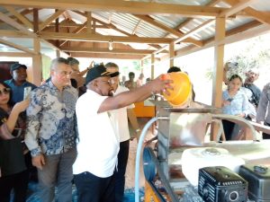Duta Besar (Dubes) New Zealand (Selandia Baru) untuk Indonesia, Philip Nathan Taula bersama Kepala Perwakilan Food and Agriculture Organization (FAO) untuk Indonesia dan Timor Leste, Rajendra Aryal dan tim dari Kementerian Pertanian Republik Indonesia dan Bupati Jayapura, Dr. Yunus Wonda, SH, MH sedang mendemonstrasikan cara mengolah ampas sagu menjadi tepung sagu, di Rumah Sagu “Holey Narey” Kampung Babrongko, Distrik Ebungfauw, Kamis (19/11/2025).