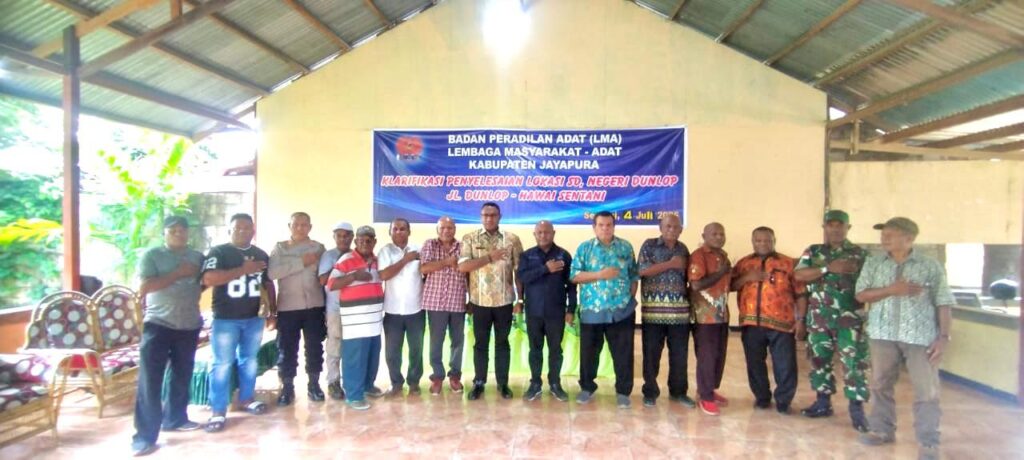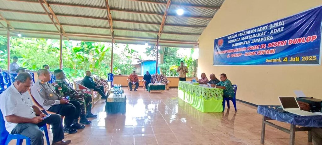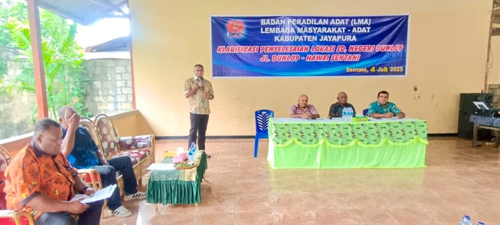SENTANI, jayapurakab.go.id – Badan Peradilan Adat Lembaga Masyarakat Adat (LMA) Kabupaten Jayapura gelar rapat klarifikasi lokasi tanah SD Negeri Dunlop Hawai Sentani bersama pemilik hak ulayat dari tanah adat Wakhuyauw, yakni Suku Nelem Imea atau Marga Kopeuw. Rapat klarifikasi tanah SD N Dunlop Sentani di hadiri Ketua LMA Kabupaten Jayapura, Friets Maurits Felle, S.H., Ketua Peradilan Adat LMA Kabupaten Jayapura Ramses Wally, pemilik hak ulayat dari Keluarga Kopeuw Jhon Kopeuw, Asisten I Bidang Pemerintahan Setda Kabupaten Jayapura, Gilberd R. Yakwart, S. STP., Kabag Hukum dan Perundang- undangan, serta undangan lainnya, bertempat di Obhe Manggali Jln. Pasar Baru Sentani, Jumat 04/07/2025.