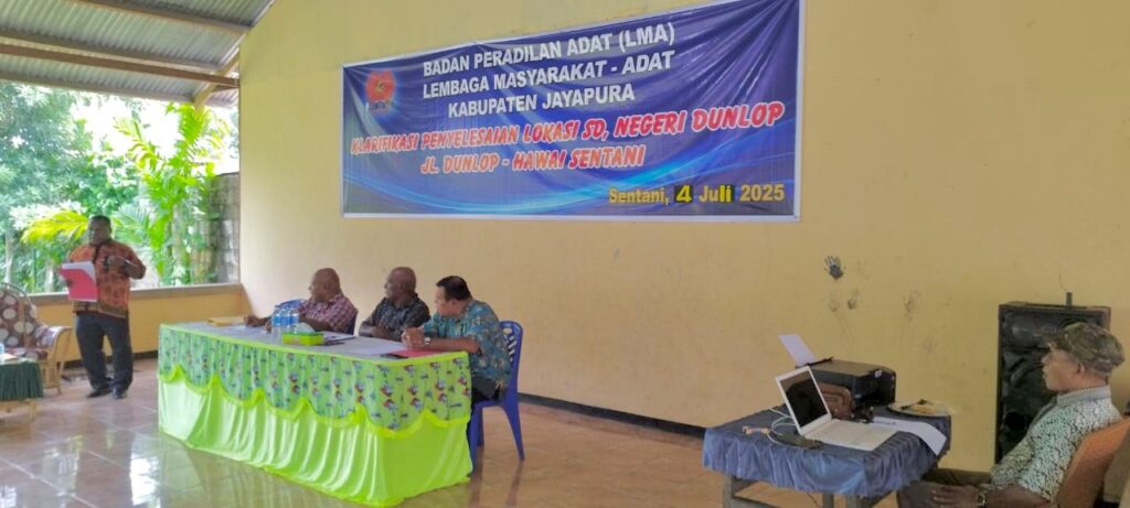 SENTANI, jayapurakab.go.id – Badan Peradilan Adat Lembaga Masyarakat Adat (LMA) Kabupaten Jayapura gelar rapat klarifikasi lokasi tanah SD Negeri Dunlop Hawai Sentani bersama pemilik hak ulayat dari tanah adat Wakhuyauw, yakni Suku Nelem Imea atau Marga Kopeuw. Rapat klarifikasi tanah SD N Dunlop Sentani di hadiri Ketua LMA Kabupaten Jayapura, Friets Maurits Felle, S.H., Ketua Peradilan Adat LMA Kabupaten Jayapura Ramses Wally, pemilik hak ulayat dari Keluarga Kopeuw Jhon Kopeuw, Asisten I Bidang Pemerintahan Setda Kabupaten Jayapura, Gilberd R. Yakwart, S. STP., Kabag Hukum dan Perundang- undangan, serta undangan lainnya, bertempat di Obhe Manggali Jln. Pasar Baru Sentani, Jumat 04/07/2025.