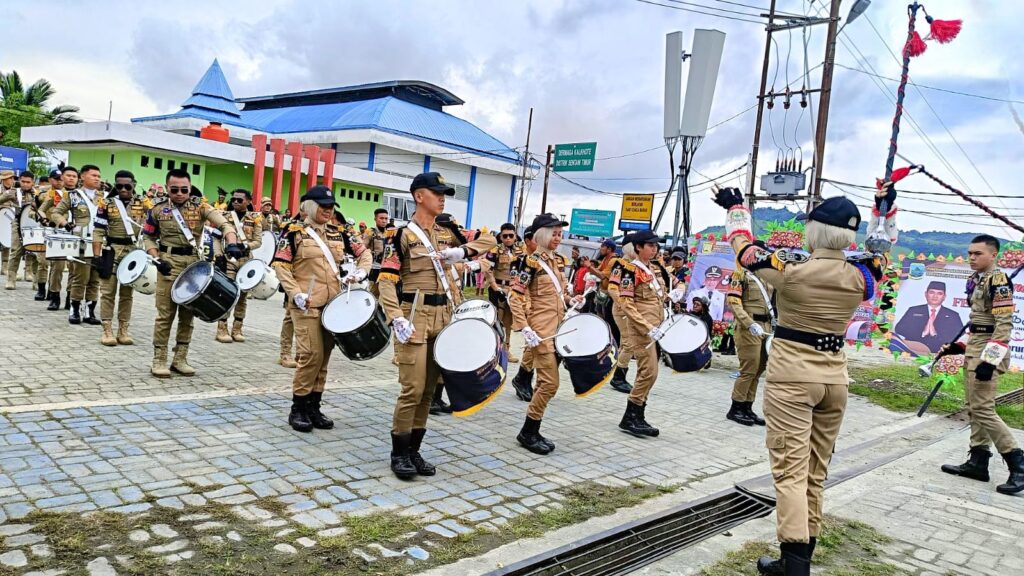 Di mana Pj Bupati Triwarno berdiri di atas Drumband yang disusun ke atas sambil memegang tongkat bersama mahasiswa Praja IPDN Kampus Papua.
