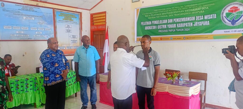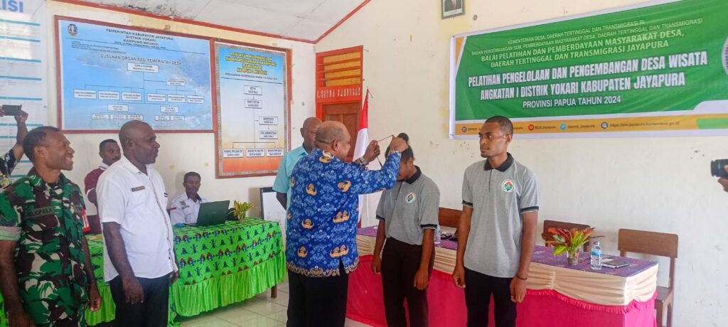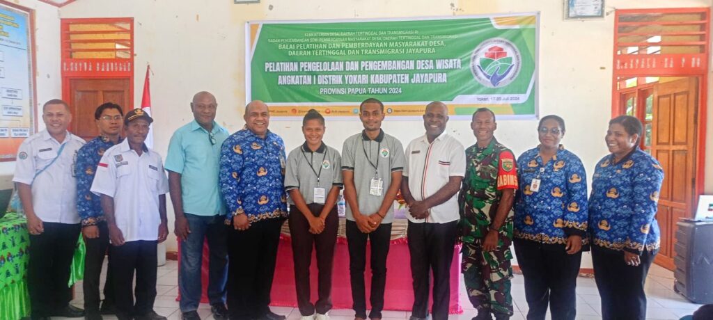 SENTANI, jayapurakab.go.id – Kementerian Desa Daerah Tertinggal dan Transmigrasi RI Badan Pengembangan Sumber Daya Manusia Pemberdayaan Masyarakat Desa daerah tertinggal dan transmigrasi melakukan Pelatihan Pengelolaan dan Pengembangan desa wisata angkatan 1 Distrik Yokari Kabupaten Jayapura, Provinsi Papua yang berlangsung dari tanggal 17 – 20 Juli 2024.