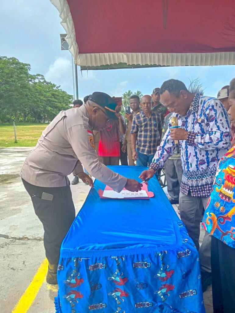 SENTANI, jayapurakab.go.id – Perdamaian Pasca Kericuhan Tanggal 1 Januari 2024 Antar Warga Eks Transmigrasi dan Warga Kwansu Grime di Kampung Karyabumi Besum, Distrik Namblong, Kabupaten Jayapura yang dipimpin oleh Penjabat (Pj) Bupati Jayapura, Dr. Ir. Semuel Siriwa, M.Si., Sekda, Hana S. Hikoyabi., Asisten I Bidang Pemerintahan Setda Kabupaten Jayapura, Dr. Elpyna D. Situmorang., Beberapa Kepala OPD, TNI/Polri, Kepala Distrik, Kepala Kampung, dan masyarakat di Kampung Karyabumi Besum, Sebtu, 09/11/2024.
