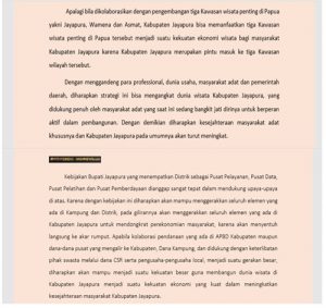 Apalagi bila dikolaborasikan dengan pengembangan tiga Kawasan wisata penting di Papua yakni Jayapura, Wamena dan Asmat, Kabupaten Jayapura bisa memanfaatkan tiga Kawasan wisata penting di Papua tersebut menjadi suatu kekuatan ekonomi wisata bagi masyarakat Kabupaten Jayapura karena Kabupaten Jayapura merupakan pintu masuk ke tiga Kawasan wilayah tersebut.