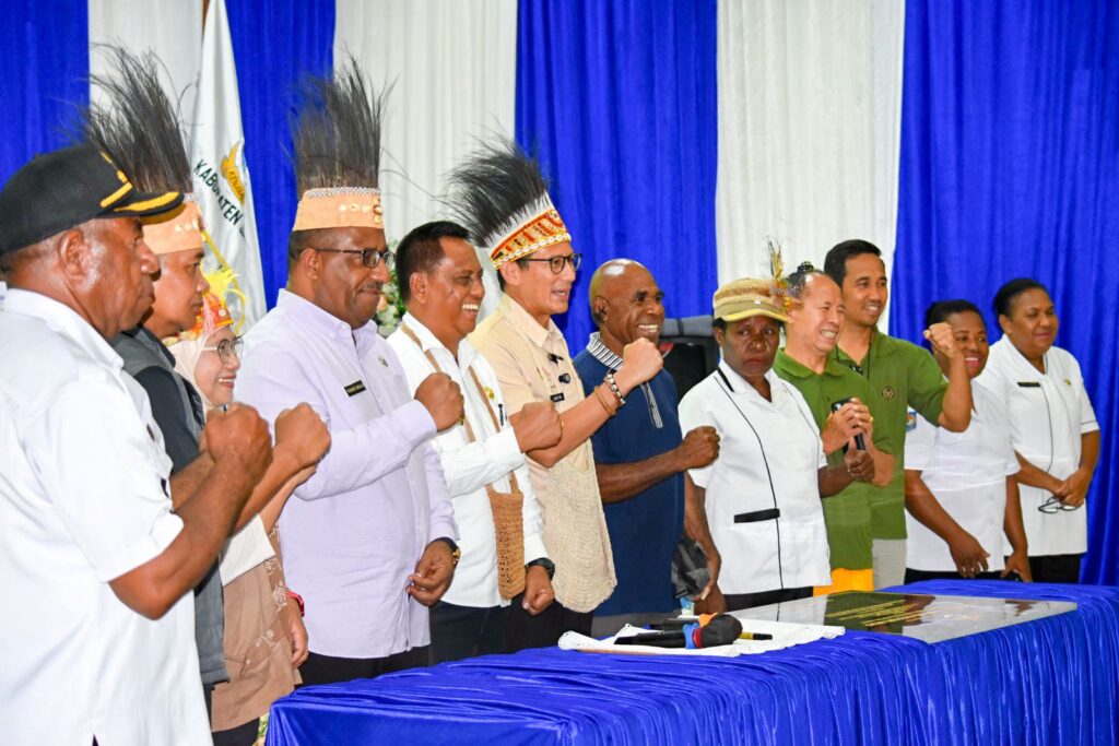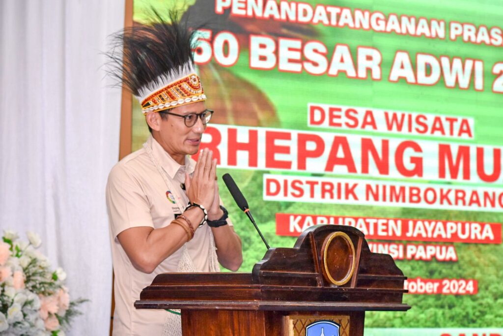 Kunjungannya Menparekraf Sandiaga Salahuddin Uno ke Pemkab Jayapura melakukan penandatanganan prasasti Rhepang Muaif sebagai kampung/desa wisata terbaik 2024.