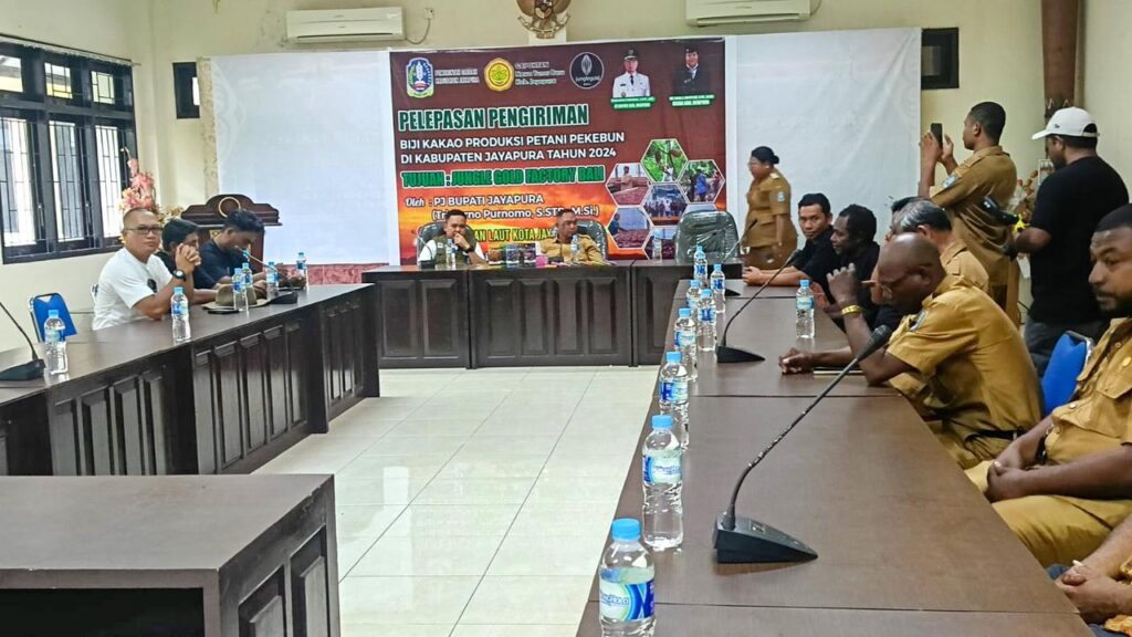 Pelepasan 4 ton biji kakao super oleh Pj Bupati Triwarno kepada Owner PT. Bali coklat, Ida Bagus Namarupa didampingi Plt Kepala Dinas Perkebunan dan Peternakan Kabupaten Jayapura, Jenny Susan Deda dan para petani pekebun kakao di aula lantai I Kantor Bupati Jayapura, Selasa, 02/07/2024.