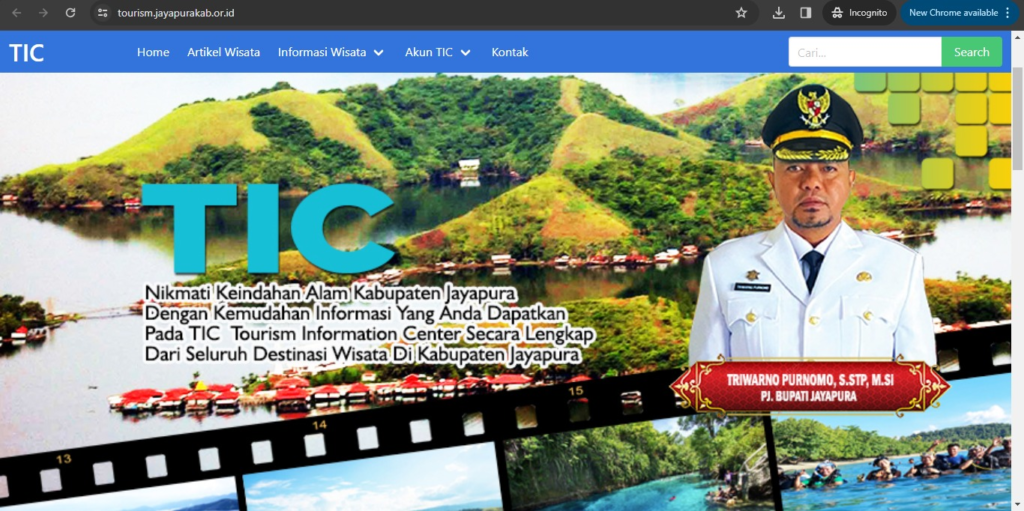 TIC Online Kabupaten Jayapura adalah sebuah platform digital yang menyediakan informasi lengkap tentang pariwisata di Kabupaten Jayapura. Melalui TIC Online, wisatawan dapat mengakses informasi terkini mengenai destinasi wisata, acara, fasilitas, serta berinteraksi langsung dengan pengelola wisata. Platform ini bertujuan untuk memudahkan wisatawan dalam merencanakan perjalanan, sekaligus mempromosikan potensi wisata daerah dan mendukung kesejahteraan masyarakat lokal.