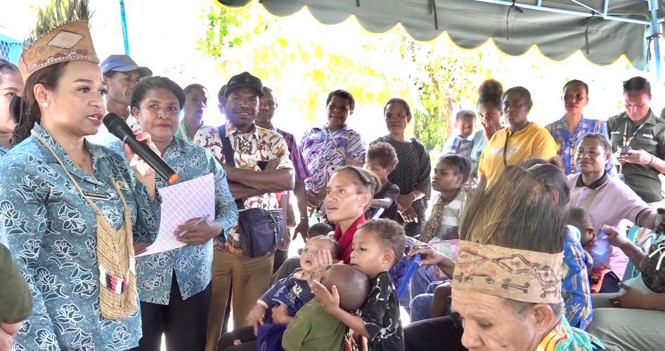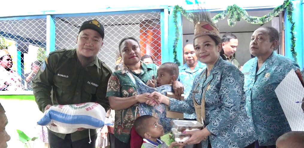Pada kesempatan itu, rombongan TP-PKK Kabupaten Jayapura secara langsung menyerahkan puluhan paket bantuan makanan tambahan intervensi stunting. Paket berisi makanan bergizi seperti daging ayam, telur, tahu dan susu kemasan, diberikan bersama edukasi gizi agar orang tua memahami pentingnya asupan gizi seimbang.